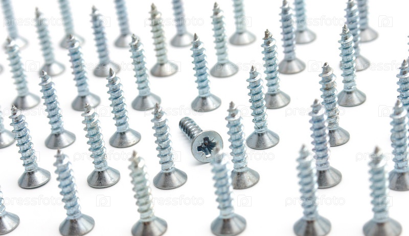 Некоторые винты на белом фоне. Эффект перспективы. В центре лежит один винт. Один был выделен из общего числа идентичных
