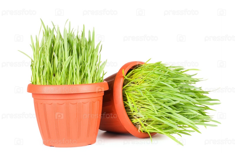 Зеленая трава в горшке на белом фоне