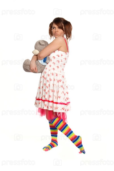 Обиженная девушка с плюшевым медведем на белом фоне
