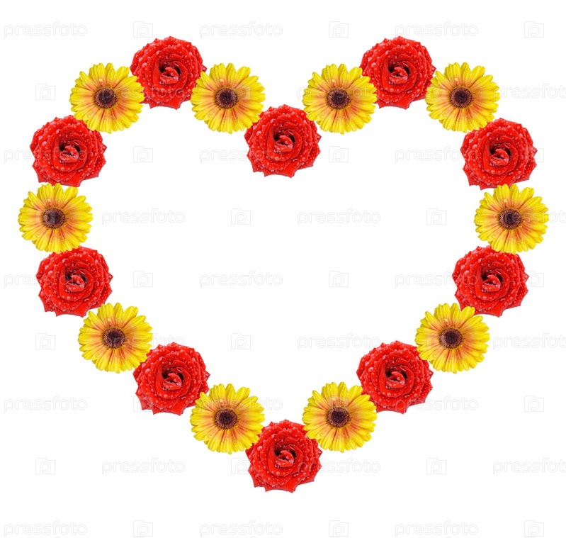 Рамка из цветов в форме сердца на белом фоне
