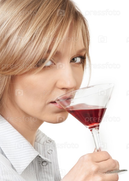 Красивая блондинка наслаждается коктейлем на белом фоне