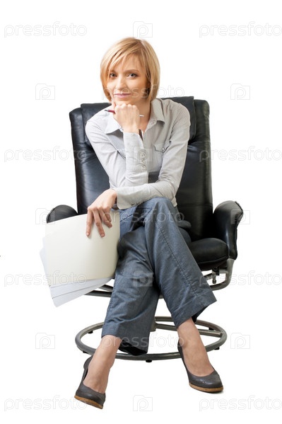Привлекательная девушка сидит в кресле и держит в руках документы