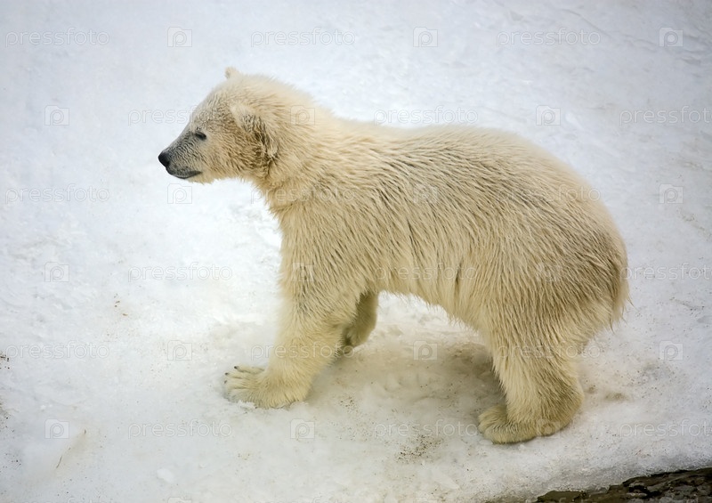 Маленький полярный медвежонок на фоне снега в зоопарке, Россия