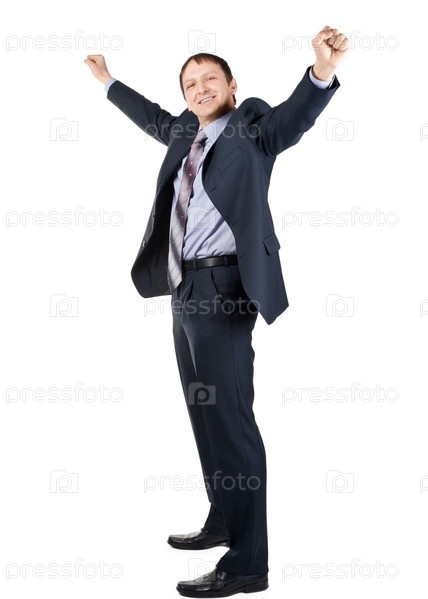 Бизнесмен с поднятыми вверх руками празднует победу