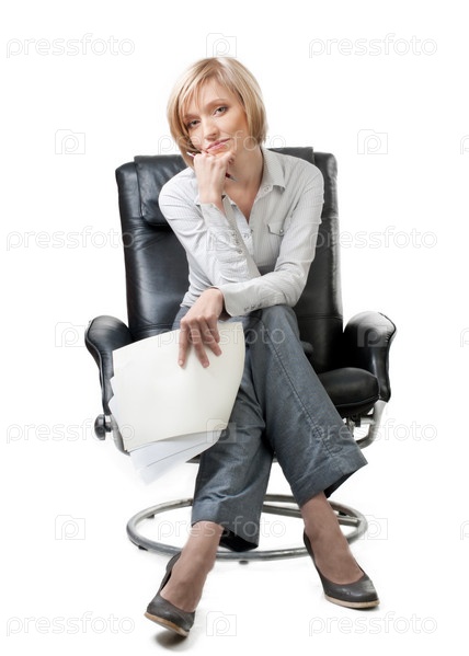 Деловая женщина сидит в кресле и держит в руках документы, изолирована на белом