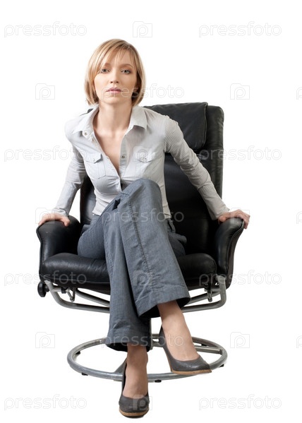 Деловая женщина сидит в кресле, изолирована на белом