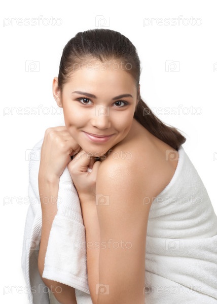 Портрет улыбающейся девушки с белым полотенцем на белом фоне