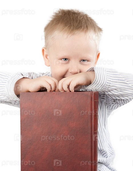 Маленький мальчик с книгой на белом фоне