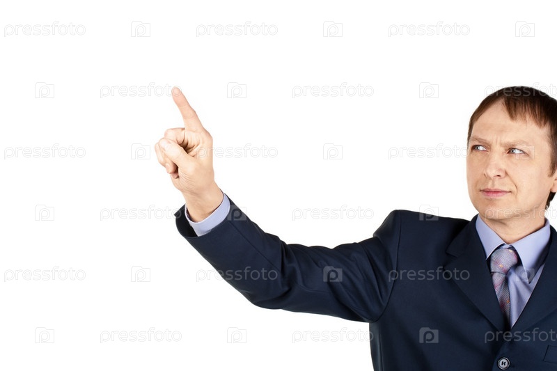 Бизнесмен нажимает на невидимую кнопку на белом фоне