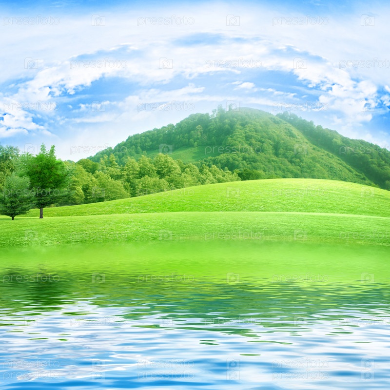 Зеленые холмы на берегу озера