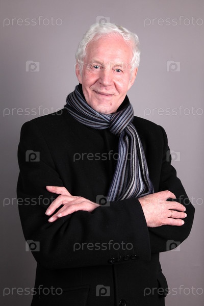 Стильный пожилой мужчина на сером фоне