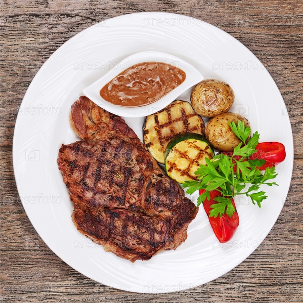 Стейк-гриль, запеченный картофель и овощи