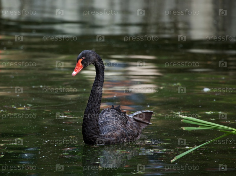 Черный лебедь плавает в пруду