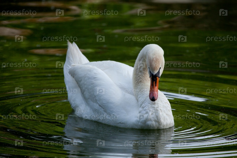 Белый лебедь плавает в пруду