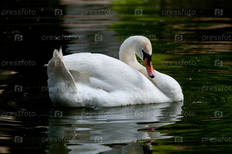 Белый лебедь плавает в пруду