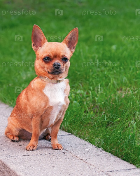 Чихуахуа, сидящая на фоне зеленой травы