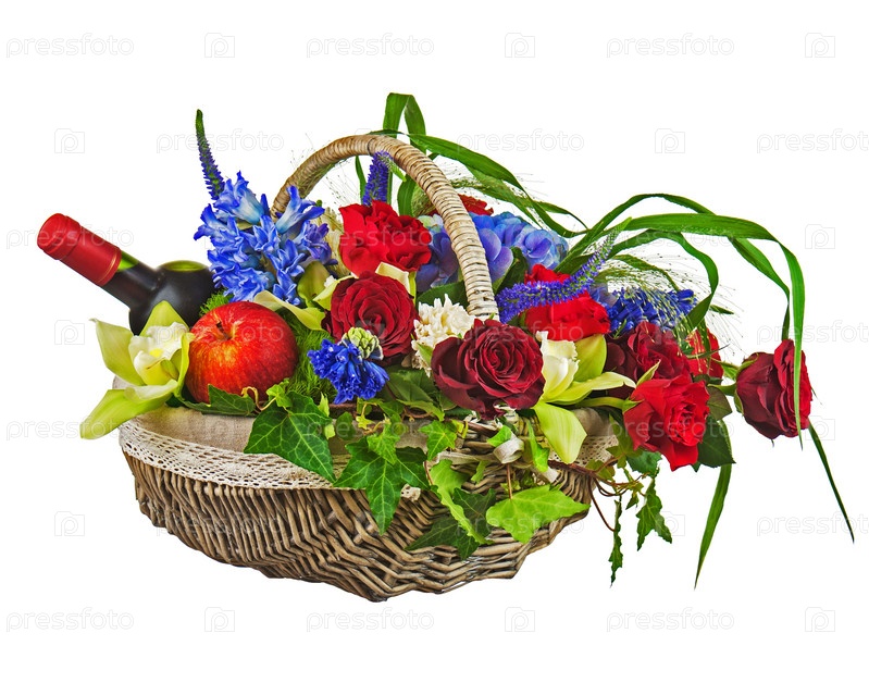 Композиция из роз, орхидей, фруктов и бутылки вина в корзине