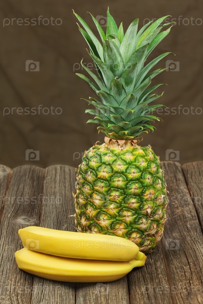 Спелый ананас и банан на деревянном столе