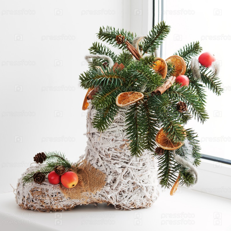 Рождественская композиция из валенка с игрушками