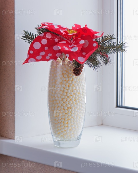 Пуансеттия с еловыми ветвями в вазе на подоконнике