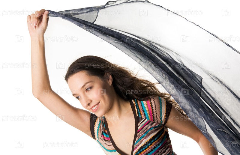 Элегантная женщина с шифонским парео на белом фоне