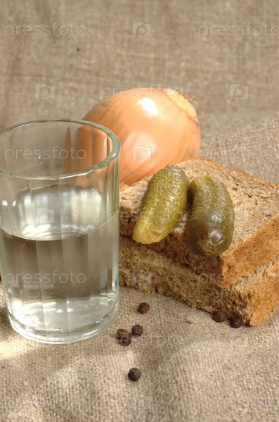 Граненый стакан с водкой, хлеб и соленый огурец