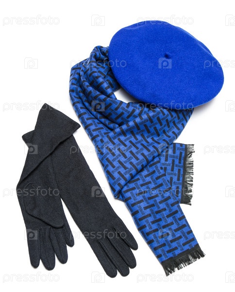 Темно-синий шарф, берет и черные шерстяные перчатки
