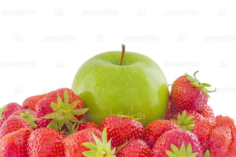 Клубника и большое зеленое яблоко, изолированные на белрм фоне