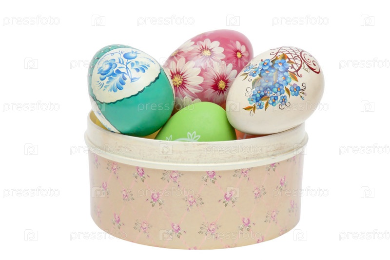 Коробочка с пасхальными яйцами на белом фоне