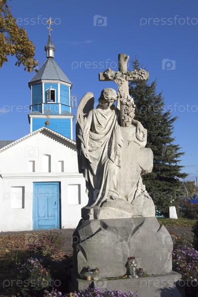 Статуя ангела с крестом на могильной плите возле православной церкви