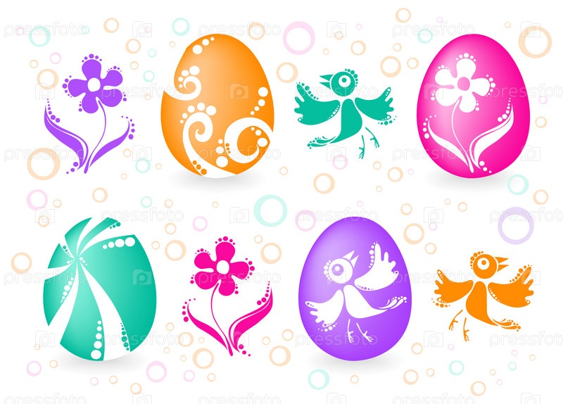Пасхальные яйца и птицы на белом фоне