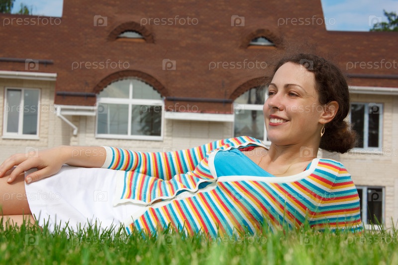 Счастливая девушка на лужайке перед новым домом