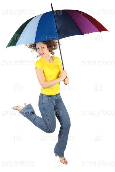 Молодая женщина в желтой футболке с разноцветным зонтиком, изолирована на белом