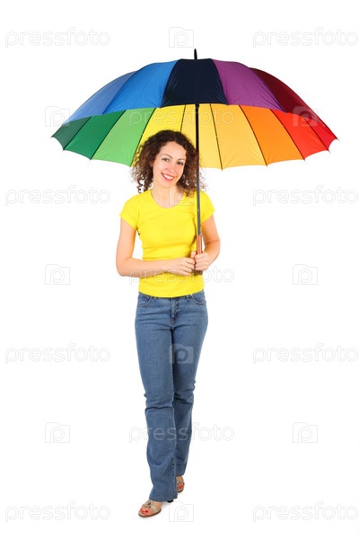 Молодая женщина в желтой футболке с разноцветным зонтиком, изолирована на белом