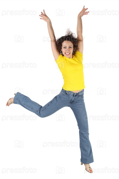 Молодая привлекательная женщина прыгает, изолирована на белом