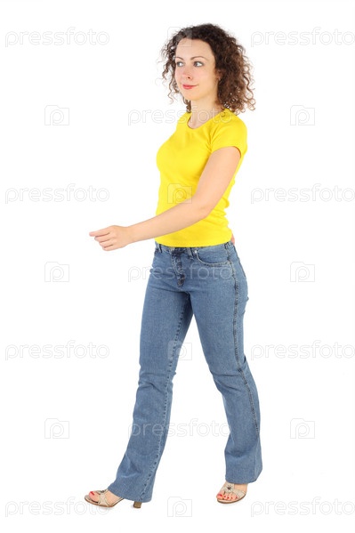Молодая привлекательная женщина идет, изолирована на белом