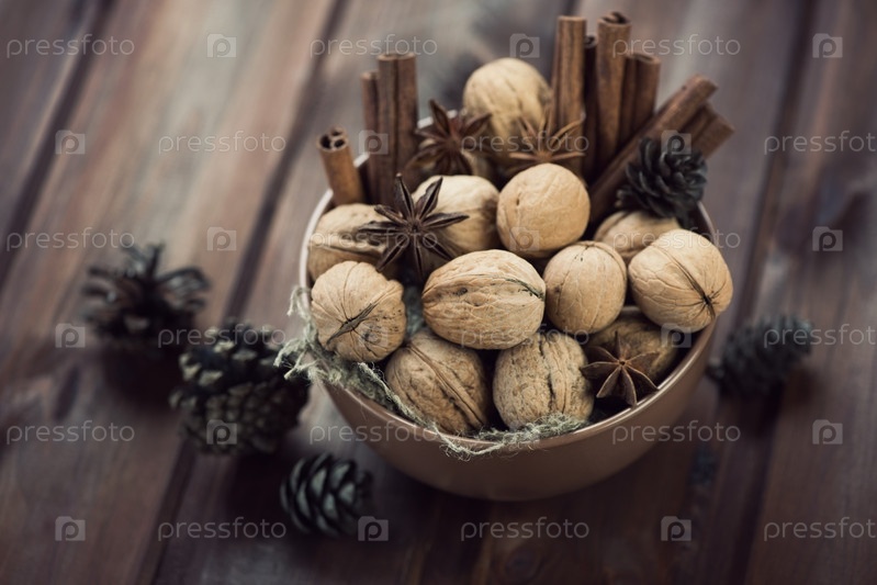 Грецкие орехи, корица, анис и шишки на деревянной поверхности