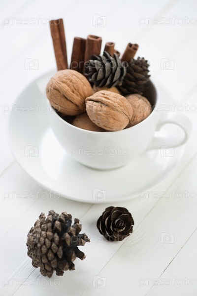 Чашка с грецкими орехами, корицей и еловыми шишками
