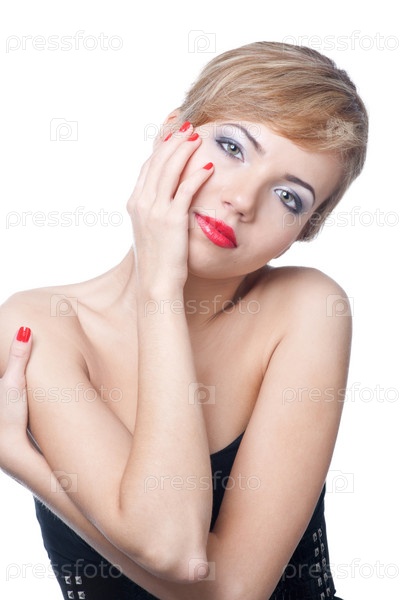 Портрет красивой женщины с красным маникюром и макияжем на белом фоне