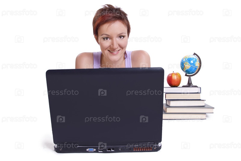 Студентка и ноутбук с глобусом на белом фоне
