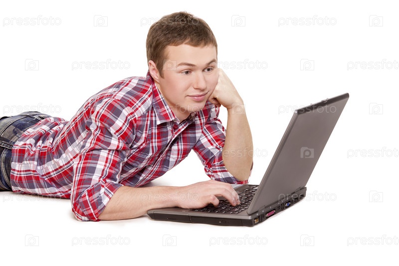 Студент лежит с ноутбуком на белом фоне