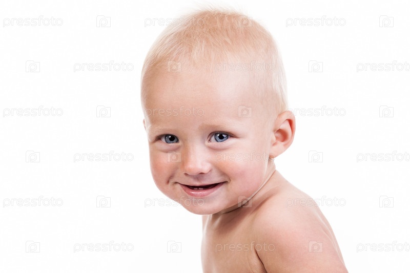 Портрет улыбающегося 9-месячного мальчика на белом фоне