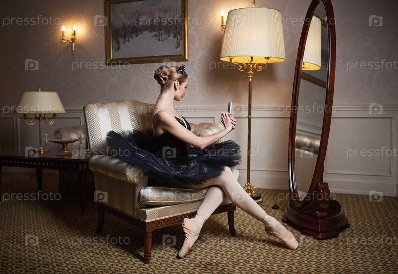 Балерина в черной пачке сидит перед зеркалом