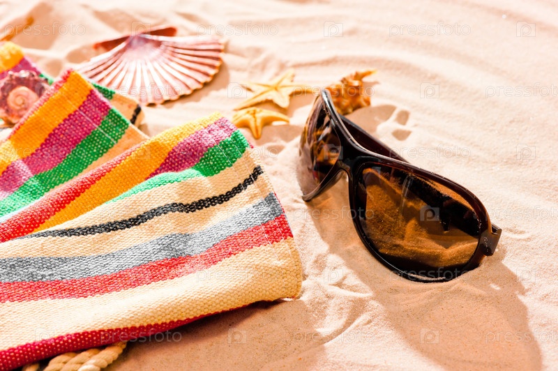 Солнцезащитные очки и пляжные аксессуары на песке