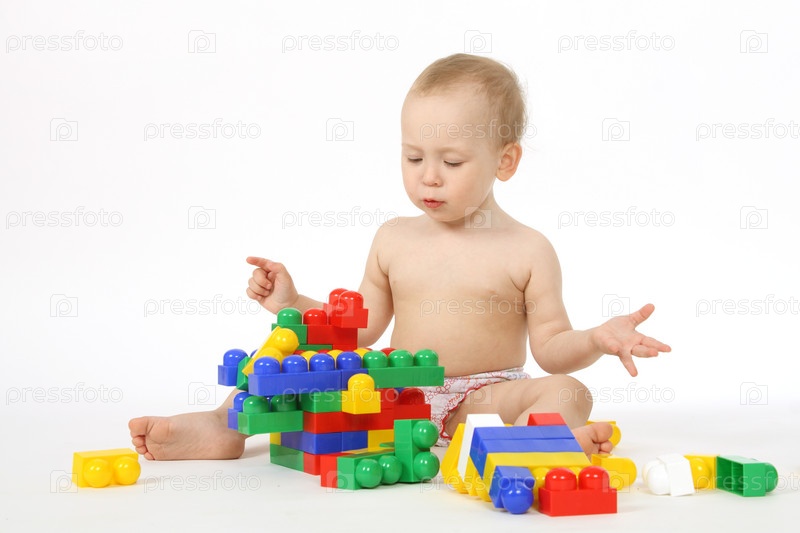 Маленький ребенок играет дизайнера на белом фоне