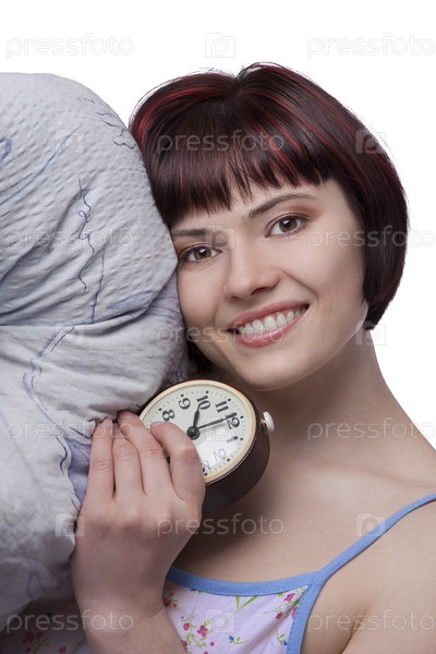 Улыбающаяся девушка с подушкой и будильником на белом фоне