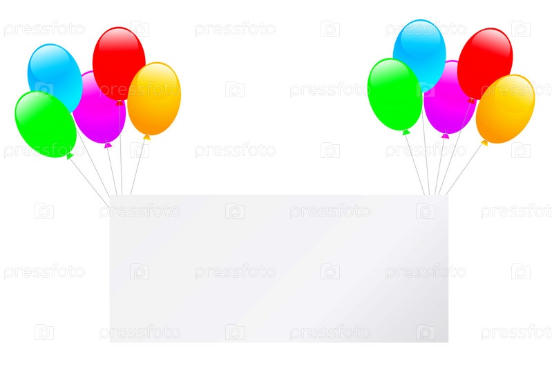 Пустой плакат привязан к воздушным шарам на белом фоне