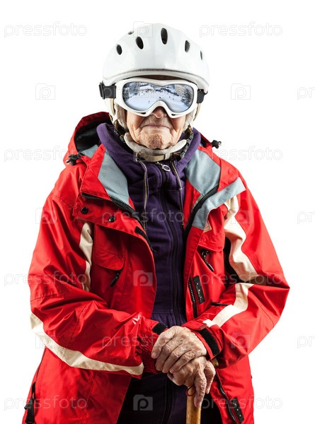 Пожилая женщина в лыжных куртке и шлеме