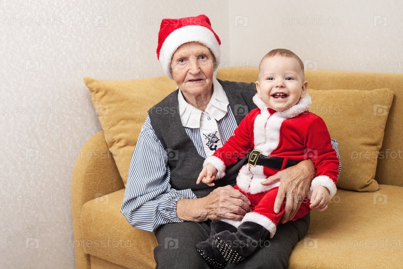 Младенец в одежде Санта-Клауса с бабушкой