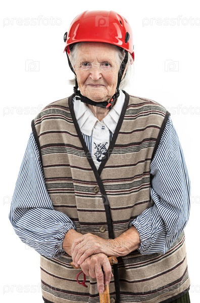 Портрет улыбающейся пожилой женщины в красном шлеме